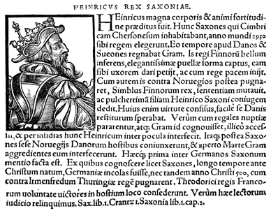 Description: An image of Heinrich, or Henry, a legendary king of Saxony killed by Gram, a legendary king of Denmark.