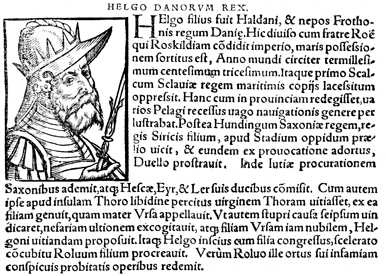 Description: An image of Helgo, the legendary King of Denmark credited with slaying Hundingus, the legendary King of Saxony.