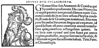 Description: An image of Grunus, a ruler of the Sicambri, or rather of the Salian Franks, and son of Antenor, a Trojan elder.