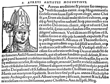 Description: An image of Aureus, a Catholic saint and the Bishop of Moguntiacum (c. 427-443 CE).