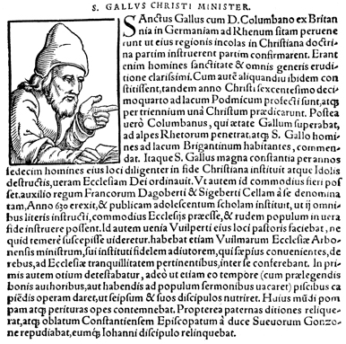 Description: An image of Gall, or Gallus, an Irish missionary and Catholic saint who according to legend was one of the twelve companions of Saint Columbanus on his mission from Ireland to the continent.