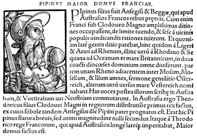 Description: An image of Pepin of Herstal, the Mayor of the Palace of Austrasia (r. 680-714 CE), Mayor of the Palace of Neustria (r. 688-695 CE), Mayor of the Palace of Burgundy (r. 688-695 CE), and the Duke of the Franks (r. 687-714 CE).