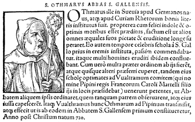 Description: An image of Othmar, a Benedictine monk, the first abbot of the Abbey of Saint Gall, and the patron saint of the city of Saint Gall.