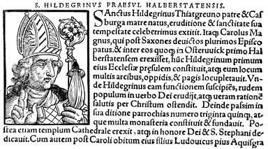 Description: An image of Hildegrim of Châlons, a Benedictine monk, the Bishop of Châlons-sur-Marne (r. 804-810 CE) and the Bishop of Halberstadt (r. 804-827 CE).