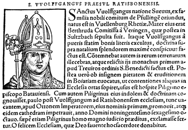 Description: An image of Wolfgang, a Catholic saint and the Bishop of Regensburg (r. 972-994 CE).