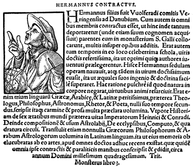 Description: An image of Hermann of Reichenau, or Hermannus Contractus, a German scholar, composer, mathematician, and astronomer.