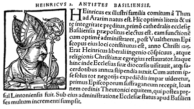 Description: An image of Heinrich II von Thun, the Bishop of Basel (r. 1216-1238 CE).