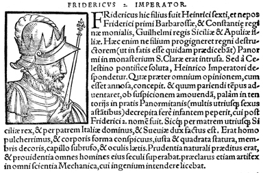 Description: An image of Frederick II, the King of Sicily (r. 1198-1250 CE), the King of Jerusalem (r. 1225-1228 CE), the Duke of Swabia (r. 1212-1216 CE), the King of Germany (r. 1212-1220 CE), the King of Italy (r. 1212-1250 CE), the Holy Roman Emperor (r. 1220-1250 CE), and the titular King of Thessalonica (r. 1230-1239 CE).