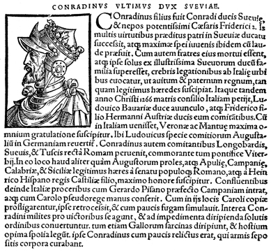 Description: An image of Conradin, the Duke of Swabia (r. 1254-1268 CE) as Conrad IV, the King of Jerusalem (r. 1254-1268 CE) as Conrad III, and the King of Sicily (r. 1254-1268 CE) as Conrad II.