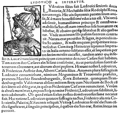 Description: An image of Louis IV the Bavarian, the Duke of Upper Bavaria (r. 1301-1347 CE), the Duke of Lower Bavaria (r. 1340-1347 CE), the Count Palatine of the Rhine (r. 1319-1329 CE), Margrave of Brandenburg (r. 1320-1323 CE), the Count of Hainaut (r. 1345-1347 CE), the Count of Holland (r. 1345-1347 CE), the Count of Zeeland (r. 1345-1347 CE), the German King (r. 1314-1347 CE), the King of Italy (r. 1327-1347 CE), and the Holy Roman Emperor (r. 1328-1347 CE).