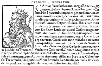 Description: An image of Charles IV, the Count of Luxembourg (r. 1346-1378 CE), the King of Bohemia (r. 1346-1378 CE), the German King (r. 1346-1378 CE), the King of Italy (r. 1355-1378 CE), the King of Burgundy (r. 1365-1378 CE), the Margrave of Brandenburg (r. 1373-1378 CE), and the Holy Roman Emperor (r. 1355-1378 CE).