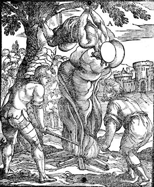 Description: A man is crucified in the method of ancient Rome, with a soldier and a man asphyxiating the crucified figure by building a fire below him.