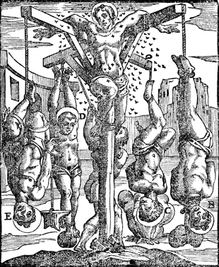 Description: Men are hanged by their feet around a figure who is crucified upright as insects swarm around them.