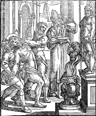 Description: A man resists as men drag him toward a figure on a pedestal.