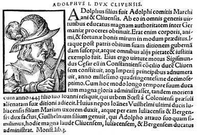 Description: An image of Adolph I, the Count of Mark (r. 1398-1448 CE), the Count of Cleves (r. 1394-1417 CE), and the Duke of Cleves (r. 1417-1448 CE).