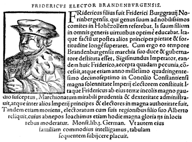 Description: An image of Frederick I, the Burgrave of Nuremburg (r. 1397-1427 CE), the Margrave of Brandenburg-Ansbach (r. 1398-1440 CE), the Margrave of Brandenburg (r. 1417-1426 CE), and the Margrave of Brandenburg-Kulmbach (r. 1420-1440 CE), and the Elector of Brandenburg (r. 1415-1440 CE).
