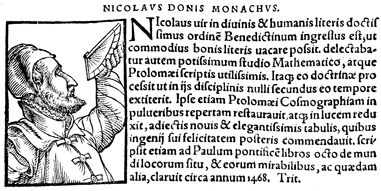 Description: An image of Donnus Nicolaus Germanus, a German cartographer.