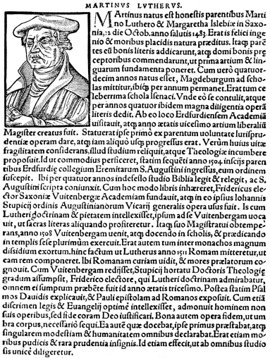 Description: An image of Martin Luther (1483-1546), a German priest, pastor, theologian, and reformer. The image is from Heinrich Pantaleone’s (1522-1595) 1565 collection of over 1500 woodcut portraits and biographies of prominent Germans. Pantaleone was a professor at the University of Basel. The verbiage is part of his biography of Luther .