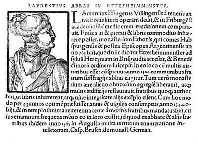Description: An image of Laurence, or Lorenz, the abbot of the Benedictine monastery at Ettenheimmünster.