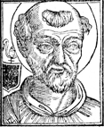 Description: An image of Saint Linus, traditionally held to be the second Pope of the Roman Catholic Church and Bishop of Rome (r. 67-79 CE). He is depicted with a nimbus; to the left is a blank coat of arms with the papal triple tiara on above.