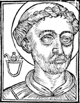 Description: An image of Saint Stephen I, Pope of the Roman Catholic Church and the Bishop of Rome (r. 254-257 CE). He is depicted with a nimbus; to the left is a blank coat of arms with the papal triple tiara above.