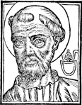 Description: An image of Saint Eutychian, or Eutychianus, Pope of the Roman Catholic Church and the Bishop of Rome (r. 275-283 CE). He is depicted with a nimbus; to the right is a blank coat of arms with the papal triple tiara above.