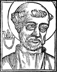 Description: An image of Saint Miltiades, or Melchiades, Pope of the Roman Catholic Church and the Bishop of Rome (r. 311-314 CE). He is depicted with a nimbus; to the left is a blank coat of arms with the papal triple tiara above.