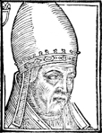 Description: An image of Felix II, Antipope of the Roman Catholic Church (r. 355-365 CE). He wears a crown; to the left is a blank coat of arms .