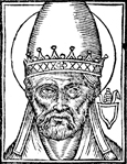Description: An image of Saint Damasus I, Pope of the Roman Catholic Church and the Bishop of Rome (r. 366-384 CE). He wears a crown and is depicted with a nimbus; to the right is a blank coat of arms with the papal triple tiara above.
