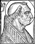 Description: An image of Saint Leo I, or Leo the Great, a Doctor of the Church, as well as the Pope of the Roman Catholic Church and Bishop of Rome (r. 440-461 CE). He wears a pallium and is depicted with a nimbus; to the left is a blank coat of arms with the papal triple tiara above.