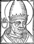 Description: An image of Saint Felix III, Pope of the Roman Catholic Church and the Bishop of Rome (r. 483-492 CE). He wears a crown and is depicted with a nimbus; to the left is a blank coat of arms with the papal triple tiara above.