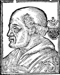 Description: An image of Saint John I, Pope of the Roman Catholic Church and the Bishop of Rome (r. 523-526 CE). He wears a pallium; to the right is a blank coat of arms with the papal triple tiara above.