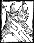 Description: An image of Boniface II, Pope of the Roman Catholic Church and the Bishop of Rome (r. 530-532 CE). He wears a pallium while to the left is a blank coat of arms with the papal triple tiara above.