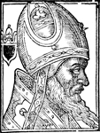 Description: An image of John IV, Pope of the Roman Catholic Church and the Bishop of Rome (r. 640-642 CE). He wears a pallium and a mitre; to the left is a blank coat of arms with the papal triple tiara above.