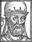 Description: An image of Saint Martin I, Pope of the Roman Catholic Church and the Bishop of Rome (r. 649-653 CE). He wears a crown while to the left is a blank coat of arms with the papal triple tiara above.