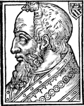 Description: An image of Saint Eugene I, or Eugenius I, Pope of the Roman Catholic Church and the Bishop of Rome (r. 654-657 CE). He wears a pallium while to the right is a coat of arms.