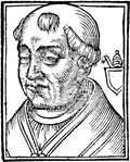Description: An image of Saint Agatho, Pope of the Roman Catholic Church and the Bishop of Rome (r. 678-681 CE). He wears a pallium; to the right is a blank coat of arms with the papal triple tiara above.