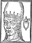 Description: An image of Saint Sergius I, Pope of the Roman Catholic Church and the Bishop of Rome (r. 687-701 CE). He wears a crown while to the right is a blank coat of arms with the papal triple tiara above.