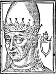 Description: An image of Stephen III, Pope of the Roman Catholic Church and the Bishop of Rome (r. 768-772 CE). He wears a crown while to the right is a blank coat of arms with the papal triple tiara above.