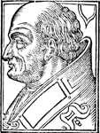 Description: An image of Saint Leo III, Pope of the Roman Catholic Church and the Bishop of Rome (r. 795-816 CE). He wears a pallium while to the right is a blank coat of arms with the papal triple tiara above.