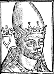Description: Romanus, pope of the Roman Catholic Church and the bishop of Rome (r. 897). He wears a pallium and a crown while to the left is a blank coat of arms with the papal triple tiara above.