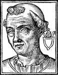 Description: Theodore II, pope of the Roman Catholic Church and the bishop of Rome (r. 897). To the left is a blank coat of arms with the papal triple tiara above.