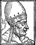 Description: Benedict IV, pope of the Roman Catholic Church and the bishop of Rome (r. 900-903). He wears a crown while to the left is a blank coat of arms with the papal triple tiara above.