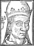 Description: Stephen VIII, pope of the Roman Catholic Church and the bishop of Rome (r. 939-942). He wears a crown while to the left is a blank coat of arms with the papal triple tiara above.