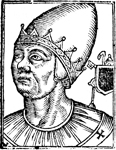 Description: John XIII, pope of the Roman Catholic Church and the bishop of Rome (r. 965-972). He wears a crown while to the right is a blank coat of arms with the papal triple tiara above and the crossed keys of the kingdom of heaven behind.
