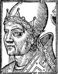 Description: Benedict VI, pope of the Roman Catholic Church and the bishop of Rome (r. 974-983). He wears a pallium and a crown while to the right is a blank coat of arms with the papal triple tiara above.