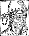 Description: Gregory V, pope of the Roman Catholic Church (r. 996-999). He wears a crown while to the left is a blank coat of arms with the papal triple tiara above.