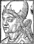 Description: Benedict VIII, pope of the Roman Catholic Church (r. 1012-1024). He wears a pallium and a crown while to the right is a blank coat of arms with the papal triple tiara above.