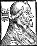 Description: Saint Leo IX, pope of the Roman Catholic Church (r. 1049-1054). He wears a pallium while to the left is a coat of arms with the papal triple tiara above.