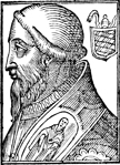 Description: Victor II, pope of the Roman Catholic Church (r. 1055-1057). He wears a pallium while to the right is a coat of arms with the papal triple tiara above.